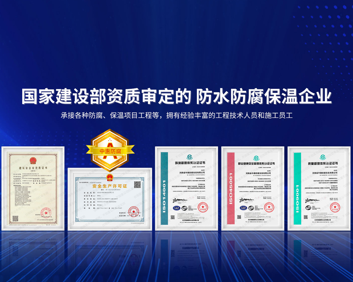 公司經營范圍:防水防腐保溫工程;消防設施工程;建筑裝修裝飾工程;建筑機電安裝工程;電力工程;建筑工程;石油化工工程;工業清洗工程;油罐清洗工程;鋼結構工程;環保工程;模板腳手架工程;電纜防火封堵、防污閃噴涂、外墻外保溫工程;各類施工勞務作業;設備維修、船舶鉚焊、涂裝;電力工程材料、建材、防水材料、防火材料、防腐保溫材料銷售,并相繼通過了GB/T19001-2008idtISO9001:2008GB/T50430-2007質量管理體系認證證書。GB/T24001-2004idtISO14001:2004環境管理體系認證證書。GB/T28001-2011idtOHSAS18001:2007職業健康安全管理體系認證證書。公司是中國防腐蝕于防護協會、中國施工企業管理協會、電力協會和中國鋼結構防水協會會員單位。 公司的經營業務涵蓋了石油、化工、電力、冶金、煤炭、船舶、國防、燃氣、水利、環保、交通運輸、航空及國防軍工和輕紡市政等行業的防腐保溫絕熱設備。鋼結構安裝、防火、防水、金屬噴鍍、聚脲噴繪、陰極保護、防滲透堵漏、玻璃鋼及各種磚版材料襯里、橡膠襯里、煙氣硫和耐酸溶劑腐蝕等工程施工。公司連續十年榮獲“省市先進施工企業”“安全生產先進單位”“重合同,守信用企業”和“AA***資質企業”的稱號。2000年被命名為市級文明單位,2002年被國家工商行政管理局命名為“重合同,守信用的企業”、被中國工業防腐蝕技術協會命名為“防腐蝕企業,能源節約及環境保護領域有豐富的經驗和***的業績。工程一次交驗合格率100%。其中攀枝花鋼鐵公司煉鐵廠四號高爐及熱風爐防腐工程、上海寶鋼公司煤氣柜防腐工程、撫順石油一廠裝置防腐項目、齊魯石化公司稀烴廠高塔防腐工程、吉林化學工業公司煉油廠油罐防腐工程、天津石化熱電廠六號爐頂棚聯絡管保溫工程、大慶油田(太倉)力神泵業工程、中國化學工程第十一建設工程、中原油田勘探局工程、中國石化銷售有限公司華北分部、魯皖輸油管道工程、貴州開磷息烽合成氨工程、陜西黃陵煤化工程、中國石油天然氣西部管道塔里木輸油工程、邯鋼集團邯寶鋼鐵公司煉鐵工程、德州供電工程、吉寶(南通)船廠工程,偃師華潤熱力工程、鄭州熱力總公司。 河南省中惠防腐安裝有限公司愿以豐富的施工經驗,***的技術,***的設備,***的管理,***的服務,竭誠為國內外廣大的用戶提供***滿意、******的工程作品。 我公司愿與國內外同仁一道,團結協作,共同推進防腐蝕行業發展! 公司地址:河南省長垣縣建設路北段360號 固定電話:0373-8866488 郵編:453400 網址:http://www_zhff_com_cn.pmjizhu.com
